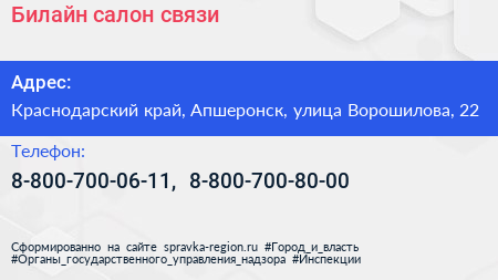 Билайн, салон связи по адресу Краснодарский край, Апшеронск, улица Ворошилова, 22 в дальнейшем Организация, размещена в следующих категориях: