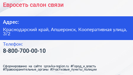 Евросеть, салон связи по адресу Краснодарский край, Апшеронск, Кооперативная улица, 3/2 в дальнейшем Организация, размещена в следующих категориях: