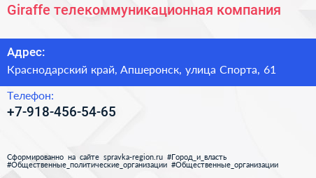 Giraffe, телекоммуникационная компания по адресу Краснодарский край, Апшеронск, улица Спорта, 61 в дальнейшем Организация, размещена в следующих категориях: