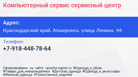 Компьютерный сервис, сервисный центр по адресу Краснодарский край, Апшеронск, улица Ленина, 44 в дальнейшем Организация, размещена в следующих категориях: