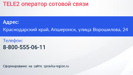TELE2, оператор сотовой связи по адресу Краснодарский край, Апшеронск, улица Ворошилова, 24 в дальнейшем Организация, размещена в следующих категориях: