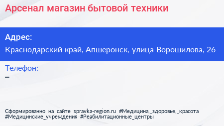 Арсенал, магазин бытовой техники по адресу Краснодарский край, Апшеронск, улица Ворошилова, 26 в дальнейшем Организация, размещена в следующих категориях: