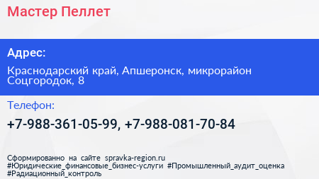 Мастер Пеллет по адресу Краснодарский край, Апшеронск, микрорайон Соцгородок, 8 в дальнейшем Организация, размещена в следующих категориях: