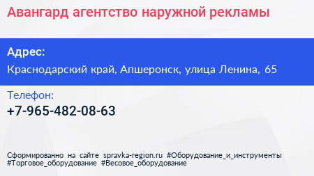 Авангард, агентство наружной рекламы по адресу Краснодарский край, Апшеронск, улица Ленина, 65 в дальнейшем Организация, размещена в следующих категориях: