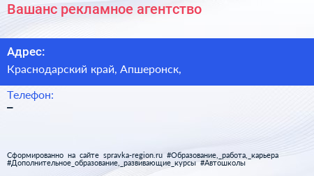 Вашанс, рекламное агентство по адресу Краснодарский край, Апшеронск, в дальнейшем Организация, размещена в следующих категориях: