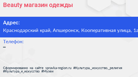 Beauty, магазин одежды по адресу Краснодарский край, Апшеронск, Кооперативная улица, 1а в дальнейшем Организация, размещена в следующих категориях: