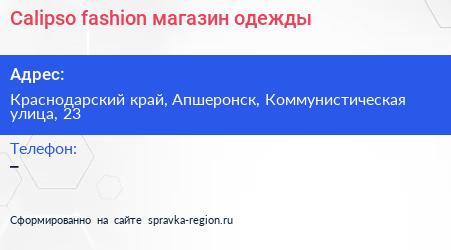 Calipso fashion, магазин одежды по адресу Краснодарский край, Апшеронск, Коммунистическая улица, 23 в дальнейшем Организация, размещена в следующих категориях:
