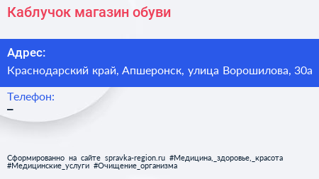 Каблучок, магазин обуви по адресу Краснодарский край, Апшеронск, улица Ворошилова, 30а в дальнейшем Организация, размещена в следующих категориях: