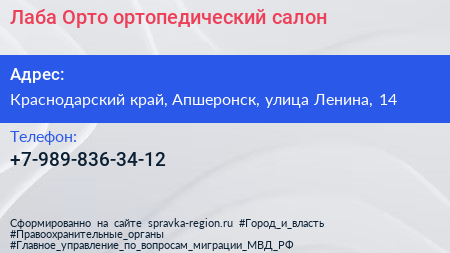 Лаба-Орто, ортопедический салон по адресу Краснодарский край, Апшеронск, улица Ленина, 14 в дальнейшем Организация, размещена в следующих категориях: