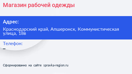 Магазин рабочей одежды по адресу Краснодарский край, Апшеронск, Коммунистическая улица, 18в в дальнейшем Организация, размещена в следующих категориях: