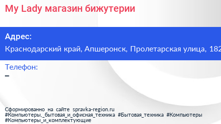 My Lady, магазин бижутерии по адресу Краснодарский край, Апшеронск, Пролетарская улица, 182 в дальнейшем Организация, размещена в следующих категориях: