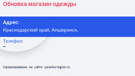 Обновка, магазин одежды по адресу Краснодарский край, Апшеронск, в дальнейшем Организация, размещена в следующих категориях: