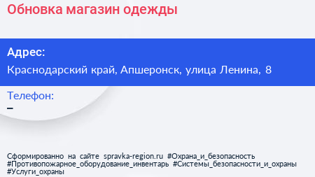 Обновка, магазин одежды по адресу Краснодарский край, Апшеронск, улица Ленина, 8 в дальнейшем Организация, размещена в следующих категориях: