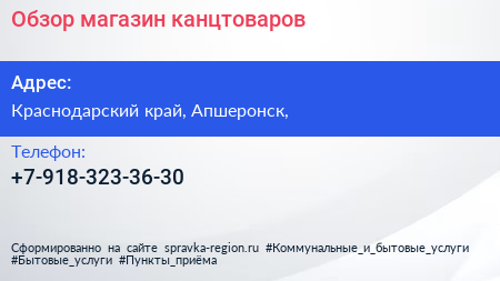Обзор, магазин канцтоваров по адресу Краснодарский край, Апшеронск, в дальнейшем Организация, размещена в следующих категориях:
