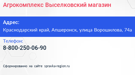 Агрокомплекс Выселковский, магазин по адресу Краснодарский край, Апшеронск, улица Ворошилова, 74а в дальнейшем Организация, размещена в следующих категориях: