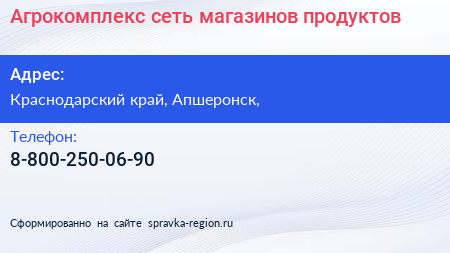 Агрокомплекс, сеть магазинов продуктов по адресу Краснодарский край, Апшеронск, в дальнейшем Организация, размещена в следующих категориях: