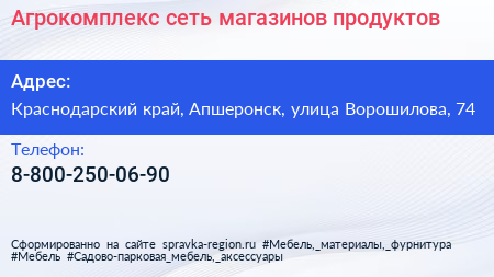 Агрокомплекс, сеть магазинов продуктов по адресу Краснодарский край, Апшеронск, улица Ворошилова, 74 в дальнейшем Организация, размещена в следующих категориях: