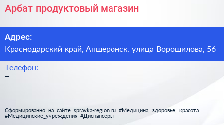 Арбат, продуктовый магазин по адресу Краснодарский край, Апшеронск, улица Ворошилова, 56 в дальнейшем Организация, размещена в следующих категориях:
