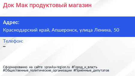 Док-Мак, продуктовый магазин по адресу Краснодарский край, Апшеронск, улица Ленина, 50 в дальнейшем Организация, размещена в следующих категориях: