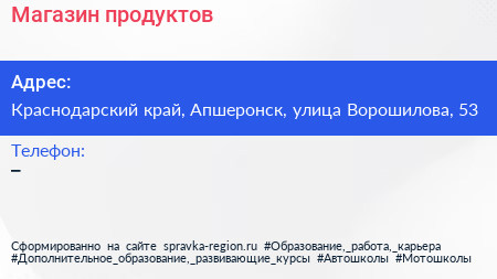 Магазин продуктов по адресу Краснодарский край, Апшеронск, улица Ворошилова, 53 в дальнейшем Организация, размещена в следующих категориях: