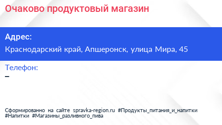 Очаково, продуктовый магазин по адресу Краснодарский край, Апшеронск, улица Мира, 45 в дальнейшем Организация, размещена в следующих категориях: