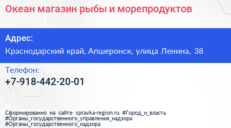 Океан, магазин рыбы и морепродуктов по адресу Краснодарский край, Апшеронск, улица Ленина, 38 в дальнейшем Организация, размещена в следующих категориях: