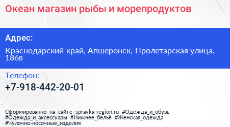 Океан, магазин рыбы и морепродуктов по адресу Краснодарский край, Апшеронск, Пролетарская улица, 186в в дальнейшем Организация, размещена в следующих категориях: