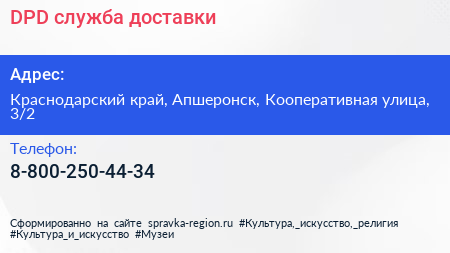 DPD, служба доставки по адресу Краснодарский край, Апшеронск, Кооперативная улица, 3/2 в дальнейшем Организация, размещена в следующих категориях: