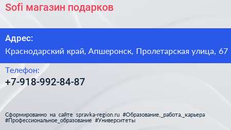 Sofi, магазин подарков по адресу Краснодарский край, Апшеронск, Пролетарская улица, 67 в дальнейшем Организация, размещена в следующих категориях:
