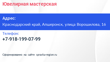 Ювелирная мастерская по адресу Краснодарский край, Апшеронск, улица Ворошилова, 16 в дальнейшем Организация, размещена в следующих категориях: