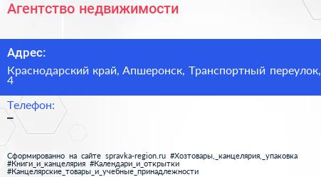 Агентство недвижимости по адресу Краснодарский край, Апшеронск, Транспортный переулок, 4 в дальнейшем Организация, размещена в следующих категориях: