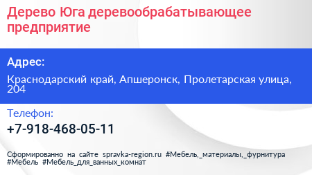 Дерево Юга, деревообрабатывающее предприятие по адресу Краснодарский край, Апшеронск, Пролетарская улица, 204 в дальнейшем Организация, размещена в следующих категориях: