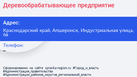 Деревообрабатывающее предприятие по адресу Краснодарский край, Апшеронск, Индустриальная улица, 6в в дальнейшем Организация, размещена в следующих категориях: