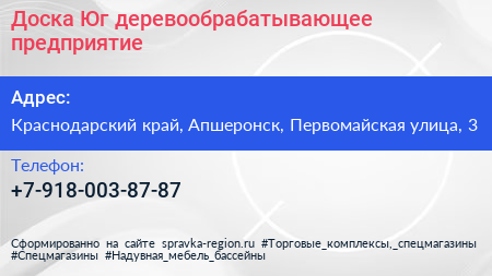 Доска Юг, деревообрабатывающее предприятие по адресу Краснодарский край, Апшеронск, Первомайская улица, 3 в дальнейшем Организация, размещена в следующих категориях: