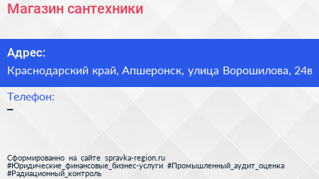 Магазин сантехники по адресу Краснодарский край, Апшеронск, улица Ворошилова, 24в в дальнейшем Организация, размещена в следующих категориях: