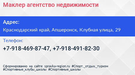 Маклер, агентство недвижимости по адресу Краснодарский край, Апшеронск, Клубная улица, 29 в дальнейшем Организация, размещена в следующих категориях:
