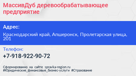 МассивДуб, деревообрабатывающее предприятие по адресу Краснодарский край, Апшеронск, Пролетарская улица, 201 в дальнейшем Организация, размещена в следующих категориях: