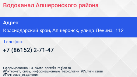 Водоканал Апшеронского района по адресу Краснодарский край, Апшеронск, улица Ленина, 112 в дальнейшем Организация, размещена в следующих категориях: