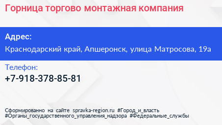 Горница, торгово-монтажная компания по адресу Краснодарский край, Апшеронск, улица Матросова, 19а в дальнейшем Организация, размещена в следующих категориях: