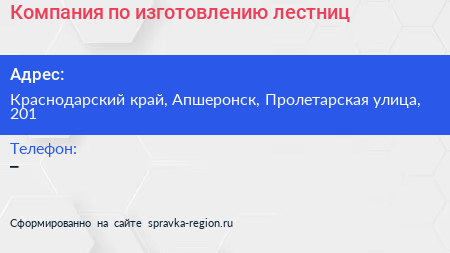 Компания по изготовлению лестниц по адресу Краснодарский край, Апшеронск, Пролетарская улица, 201 в дальнейшем Организация, размещена в следующих категориях: