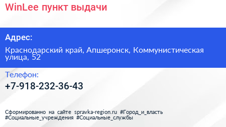 WinLee, пункт выдачи по адресу Краснодарский край, Апшеронск, Коммунистическая улица, 52 в дальнейшем Организация, размещена в следующих категориях: