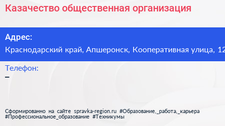 Казачество, общественная организация по адресу Краснодарский край, Апшеронск, Кооперативная улица, 12 в дальнейшем Организация, размещена в следующих категориях: