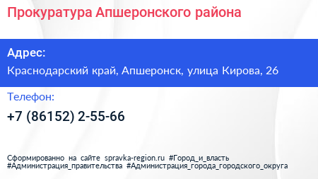 Прокуратура Апшеронского района по адресу Краснодарский край, Апшеронск, улица Кирова, 26 в дальнейшем Организация, размещена в следующих категориях:
