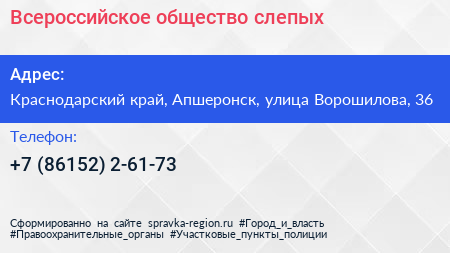Всероссийское общество слепых по адресу Краснодарский край, Апшеронск, улица Ворошилова, 36 в дальнейшем Организация, размещена в следующих категориях: