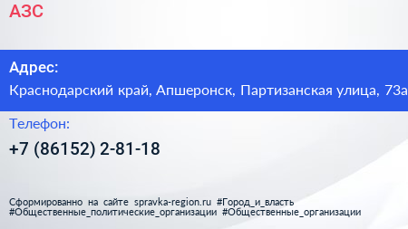 АЗС по адресу Краснодарский край, Апшеронск, Партизанская улица, 73а в дальнейшем Организация, размещена в следующих категориях: