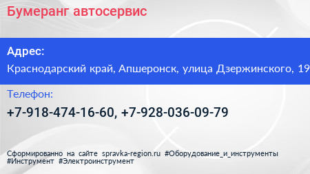 Бумеранг, автосервис по адресу Краснодарский край, Апшеронск, улица Дзержинского, 19 в дальнейшем Организация, размещена в следующих категориях: