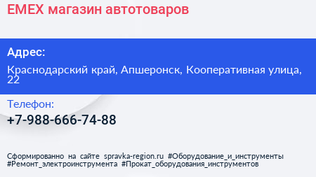 EMEX, магазин автотоваров по адресу Краснодарский край, Апшеронск, Кооперативная улица, 22 в дальнейшем Организация, размещена в следующих категориях: