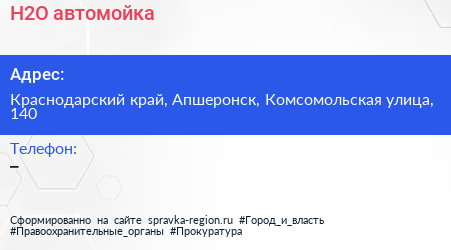 H2O, автомойка по адресу Краснодарский край, Апшеронск, Комсомольская улица, 140 в дальнейшем Организация, размещена в следующих категориях:
