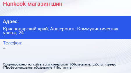 Hankook, магазин шин по адресу Краснодарский край, Апшеронск, Коммунистическая улица, 24 в дальнейшем Организация, размещена в следующих категориях: