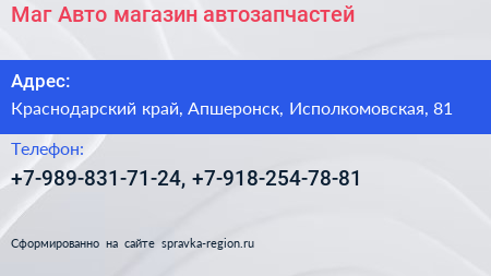 Маг Авто, магазин автозапчастей по адресу Краснодарский край, Апшеронск, Исполкомовская, 81 в дальнейшем Организация, размещена в следующих категориях: